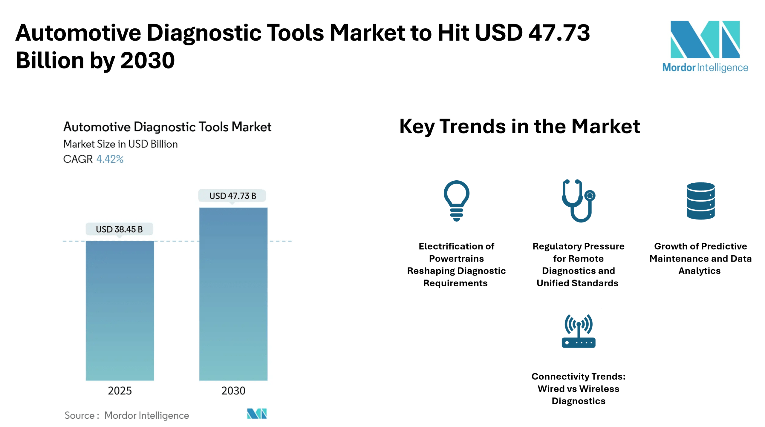 The Automotive Diagnostic Tools Market is expected to grow from approximately USD 38.45 billion in 2025 to USD 47.73 billion by 2030, expanding at a compound annual growth rate of about 4.42 percent during this period. This market size reflects rising demand across regions, especially in Asia-Pacific, where vehicle production, regulatory changes, and consumer demand for newer technologies are strongest. Key developments in powertrain types, connectivity, and regulatory frameworks are shaping the Automotive Diagnostic Tools Market Share and how companies position themselves.