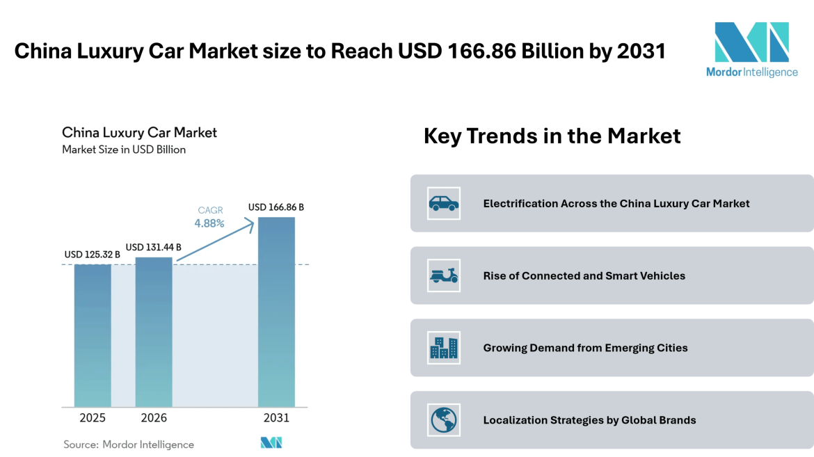 According to Mordor Intelligence, the China luxury car market size is expected to grow from USD 125.32 billion in 2025 to USD 131.44 billion in 2026, and further reach USD 166.86 billion by 2031, registering a CAGR of 4.88% during the forecast period.