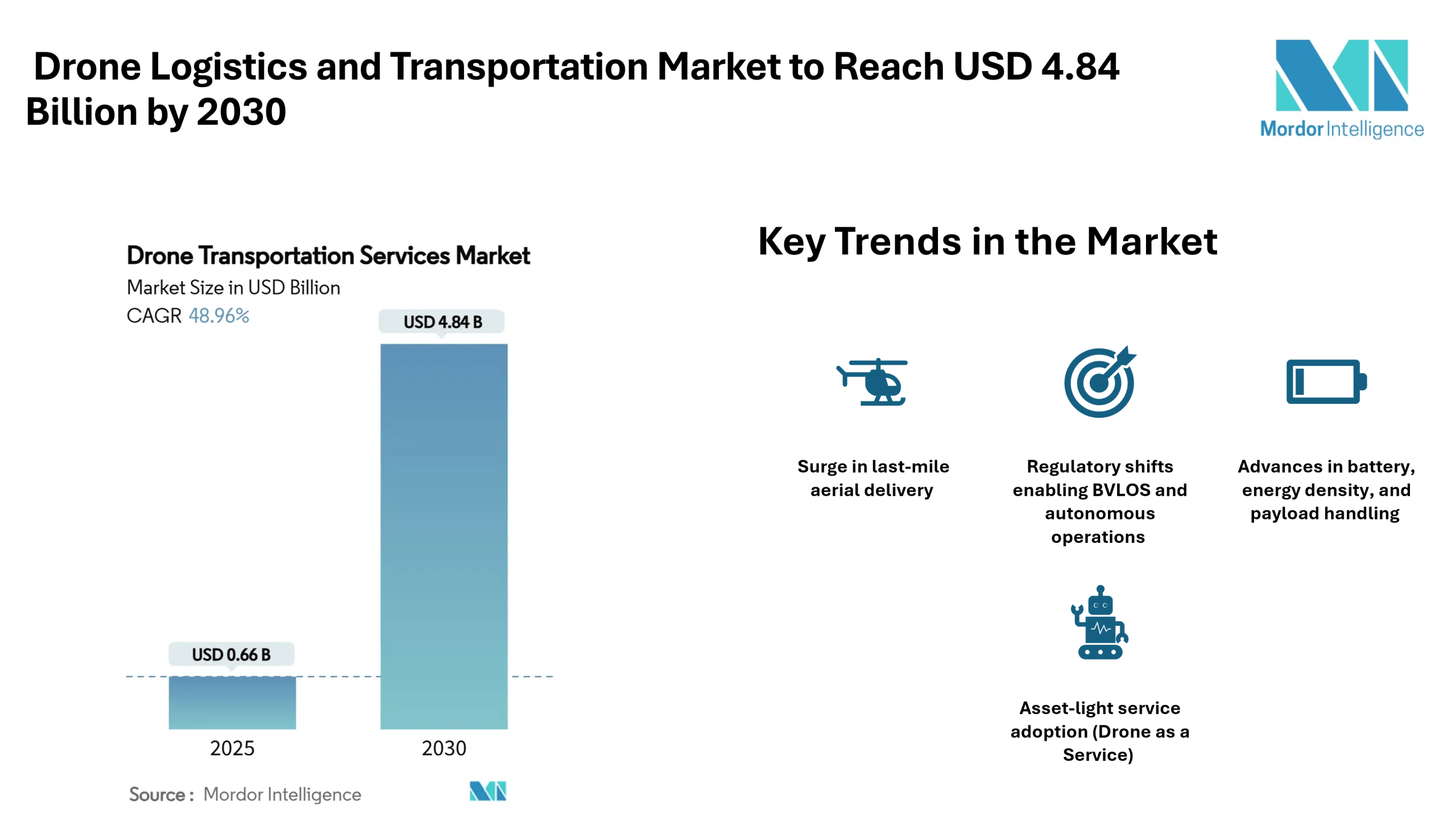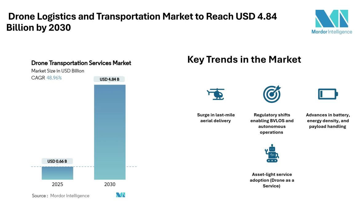 Home Press ReleasesDrone Logistics and Transportation Market to Reach USD 4.84 Billion by 2030, Driven by Aerial Last-Mile Demand and Medical Corridors – Mordor Intelligence