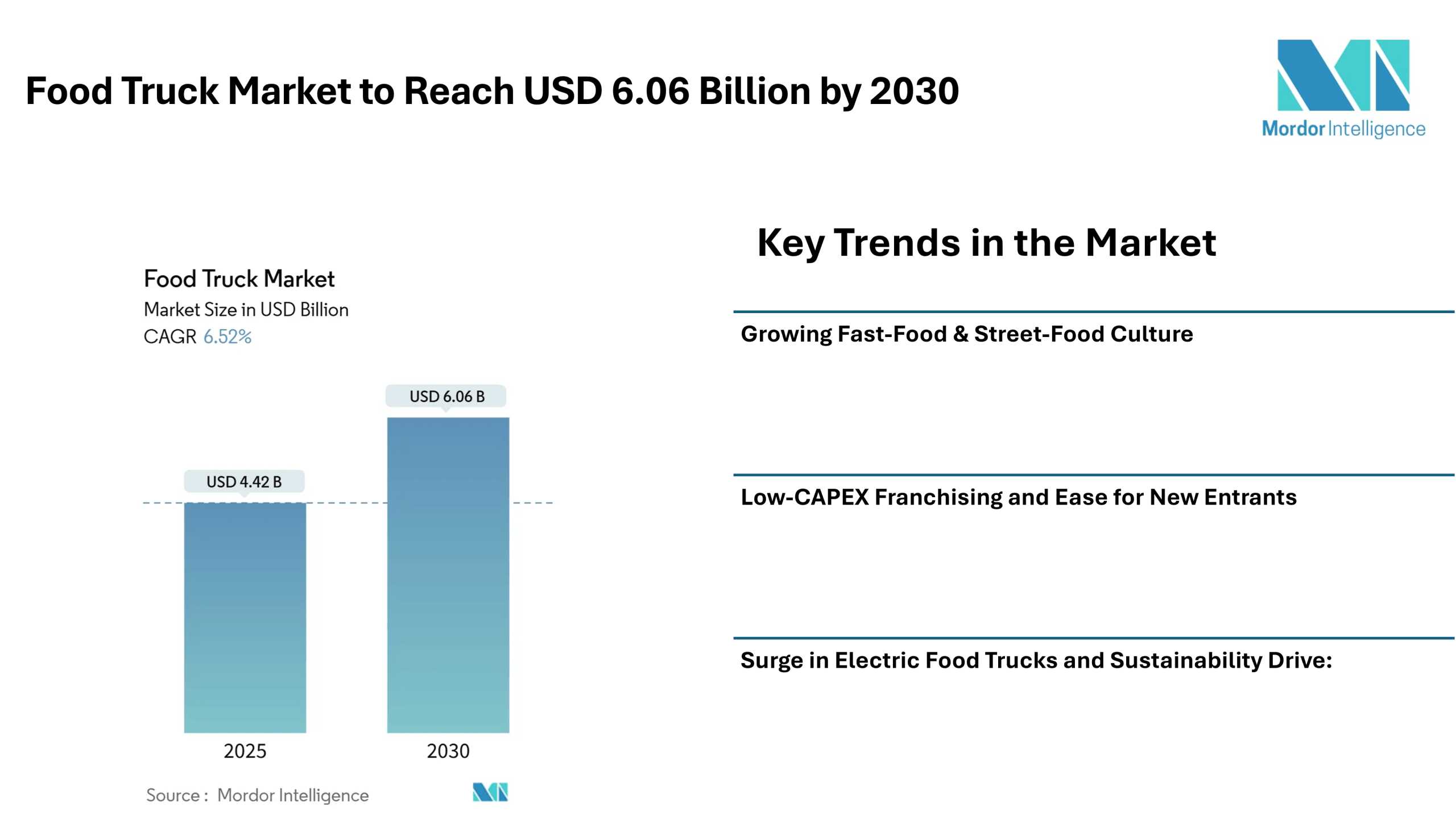 Low-CAPEX Franchising and Ease for New Entrants: Compared to opening a traditional brick-and-mortar restaurant, launching a food truck requires lower initial investment. This makes the food truck market accessible to entrepreneurs and small-business owners.