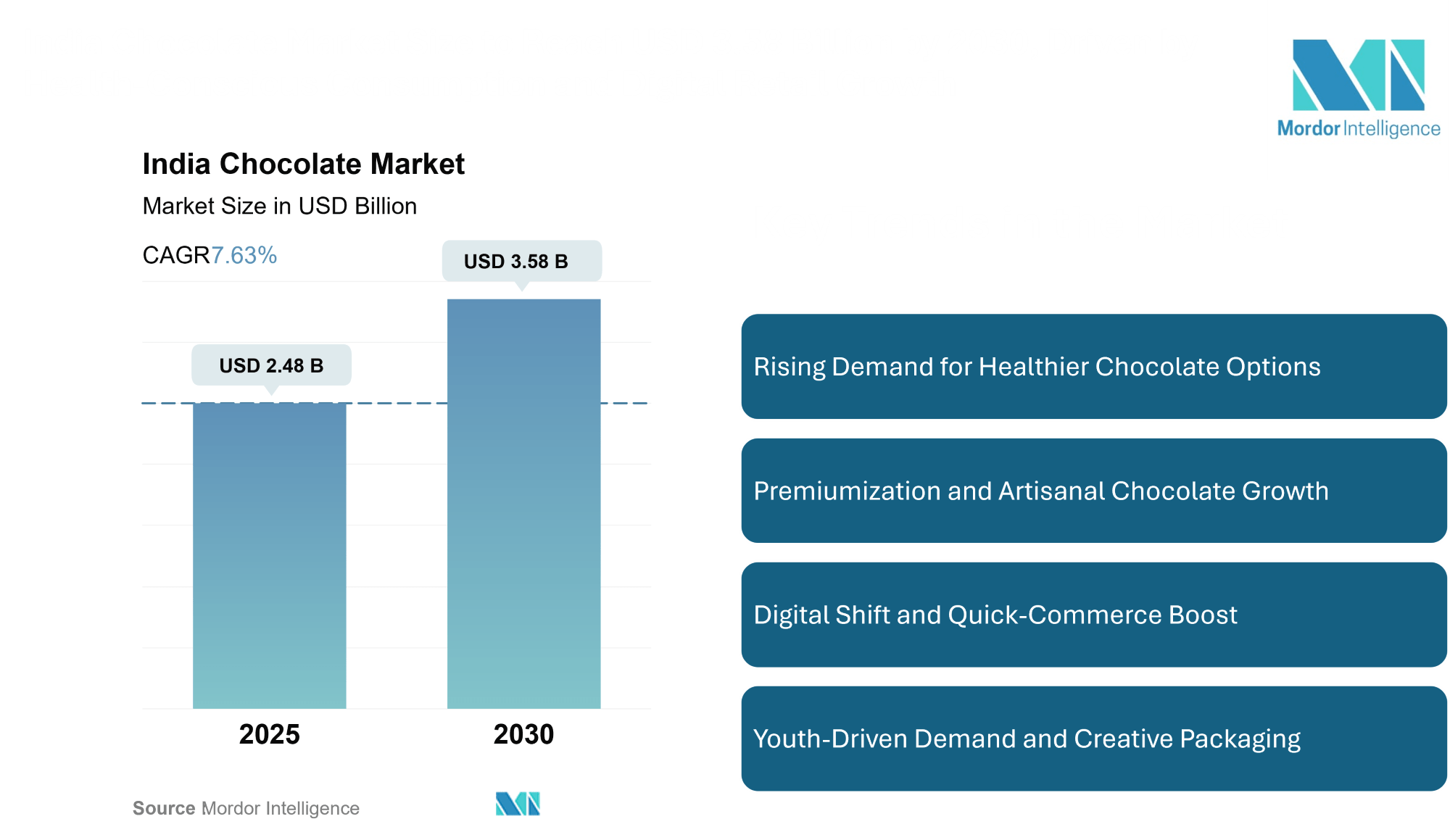 According to a 2025 report on the India Chocolate Market by Mordor Intelligence, the India Chocolate Market Size is projected to grow from USD 2.48 billion in 2025 to USD 3.58 billion by 2030, registering a CAGR of 7.63%. Rising disposable income, evolving consumer preferences, and greater awareness around health and nutrition are reshaping how Indians consume chocolate.