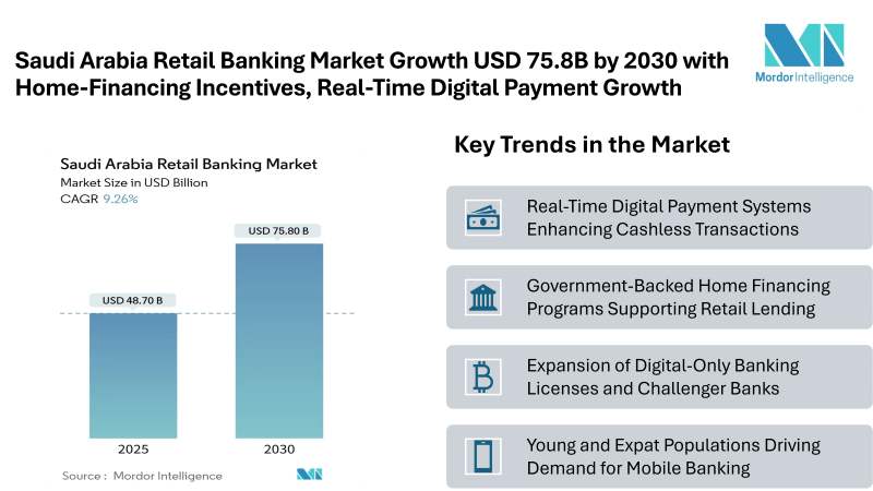 Home Press ReleasesSaudi Arabia Retail Banking Market to Reach USD 75.8 Billion by 2030 with Home-Financing Incentives and Real-Time Digital Payment Growth