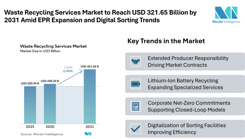 According to Mordor Intelligence, the waste recycling services market size was valued at USD 220.94 billion in 2025 and is estimated at USD 235.23 billion in 2026, projected to reach USD 321.65 billion by 2031, registering a CAGR of 6.46%. This market growth reflects tightening Extended Producer Responsibility frameworks, increased corporate sustainability commitments, and modernization of sorting and processing infrastructure.